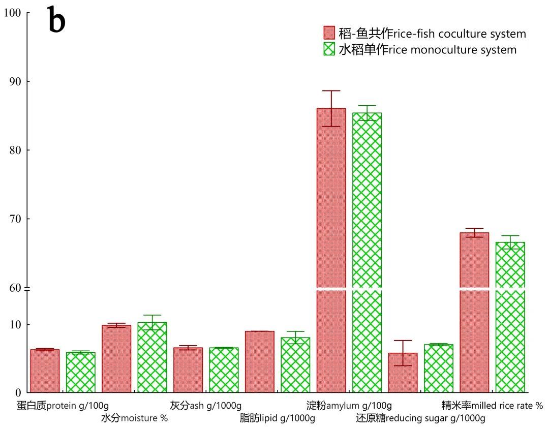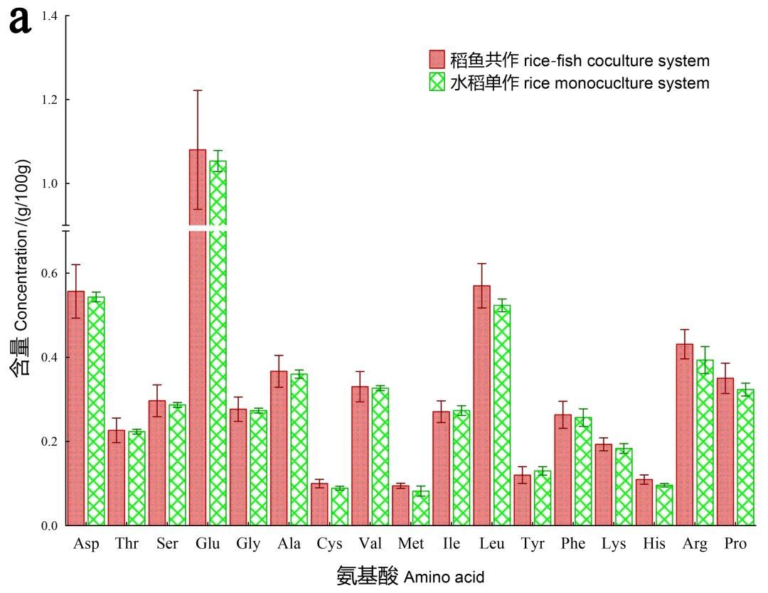 Fig. 2 Comparison on the rice grains quality (a) and amino acid contents (b) between rice-fish coculture and rice monoculture systems