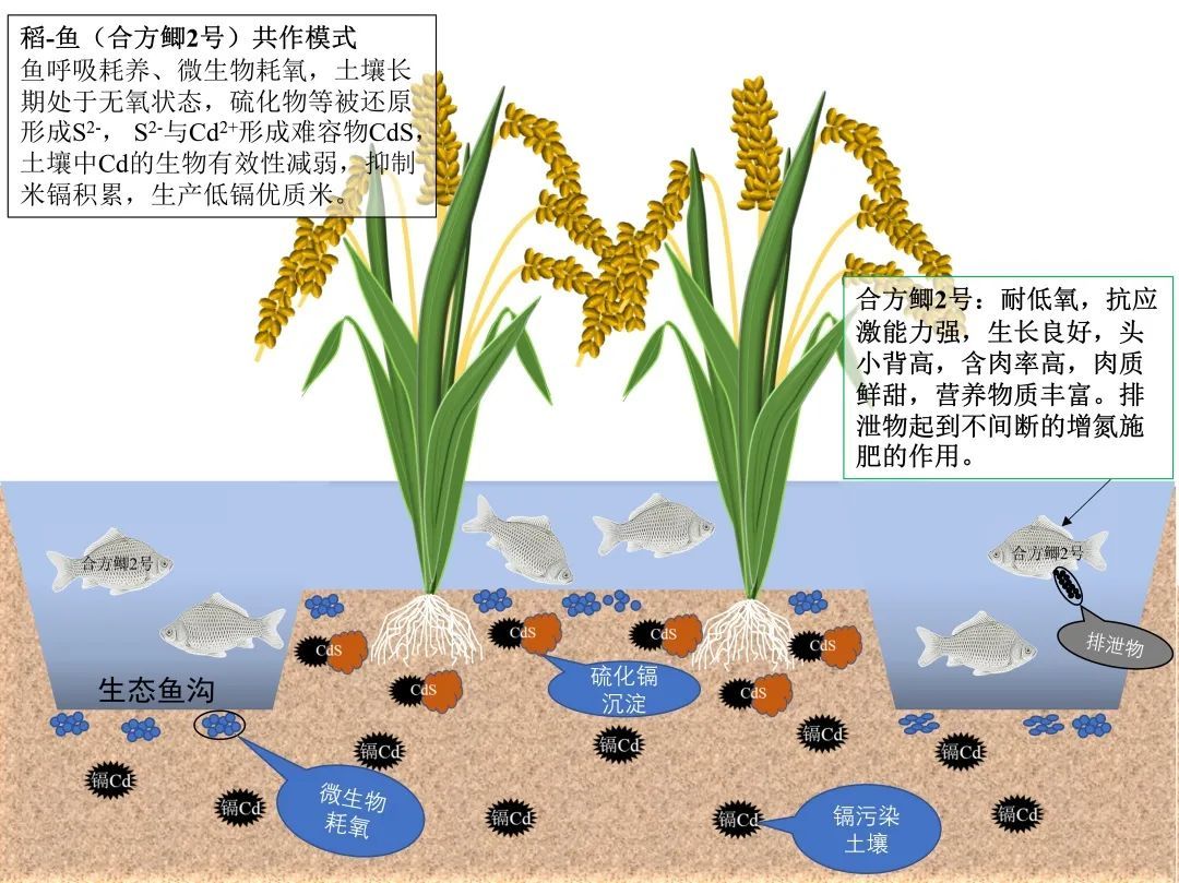 稻-鱼共作模式抑制土壤镉的生物活性,减控米镉积累,生产低镉优质米和优质鱼。